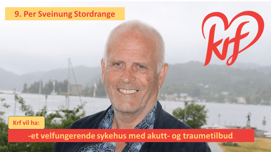 Per Sveinung Stordrange er en erfaren politiker. Han er en av dem som har vært med lengst på KrF laget. Per har vært med i bystyret, fylkestinget og er leder for brukerutvalget i Sørlandets Sykehus HF. En mann med god politisk erfaring som det er en glede å ha med på laget.